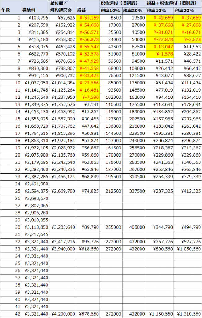 これは実際にたかっちが契約した個人年金保険の保険料、解約返戻金の推移です。損益は[解約返戻金-保険料]で計算しています。すべて累計です。ところどころ空白セルがありますが、データがないためです。無視してください。